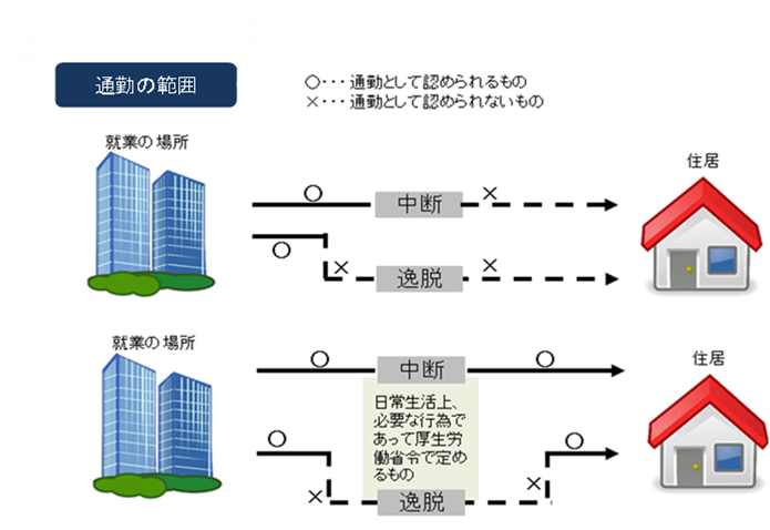 通勤の途中で経路を逸脱し、又は移動を中断した場合には、「逸脱」又は「中断」の間とその後の移動は「通勤」とはなりません。