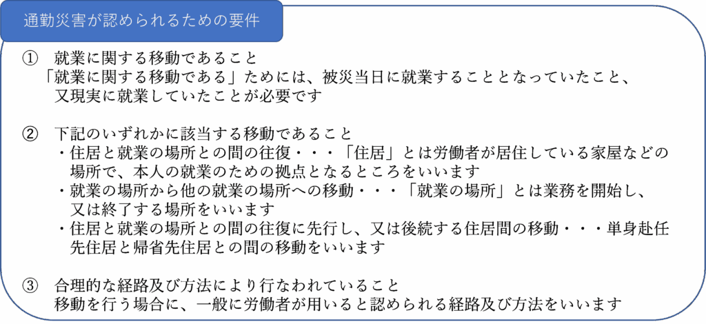では、通勤災害は通勤中であれば、どんなケースでも通勤災害となるかというとそのようなわけではありません。通勤災害と認められるための必要な要件があります。