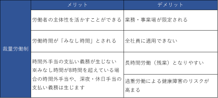 表からも分かる通り、裁量労働制は、労働者の主体性を活かして能力を発揮するためには効果的な制度ですが、長時間労働や過重労働のリスクもあります。また、会社は裁量労働制を採用しても、労働時間を管理する必要がなくなるというわけではありません。過重労働を未然に防ぐためにも勤怠管理はしっかりと行うようにしてください。