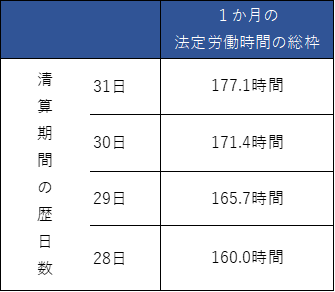 例えば、1か⽉を清算期間とした場合、法定労働時間の総枠が以下のとおりとなるため、