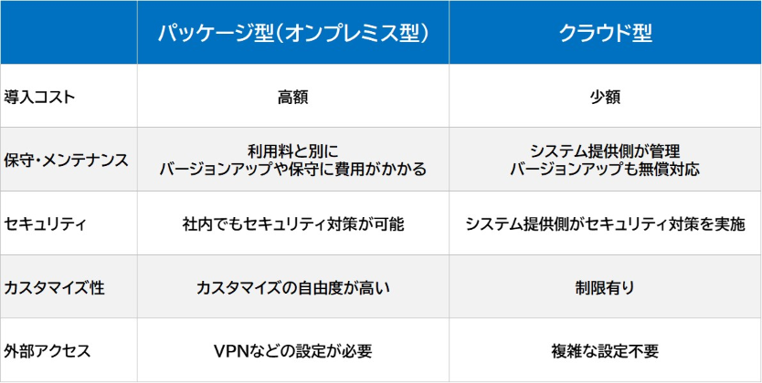 上記のうち、無料で始められるものはパッケージ型とクラウド型ですが、どの形態にもそれぞれメリットとデメリットがあるため、自社に適した形態を選ぶことが大切です。
