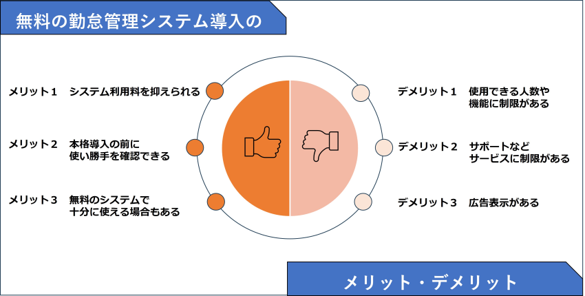 出勤・退勤の打刻機能などのシンプルな機能のみが利用できるケースが多く、他機能や他システムとの連携の場合は有料プランでしか利用できないことが多いです。自社に必要な機能が無料で利用できるシステムがあるかという視点で選択するのも一つです。