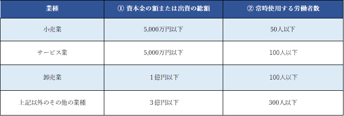 中小企業に該当するかは、以下の表の①または②を満たすかどうかで企業単位で判断されます。