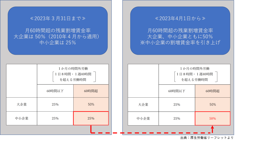 その猶予期間が終わり、2023年4月1日より中小企業も大企業と同様に60時間を超える時間外については割増率が「50%以上」へ変更となります。
