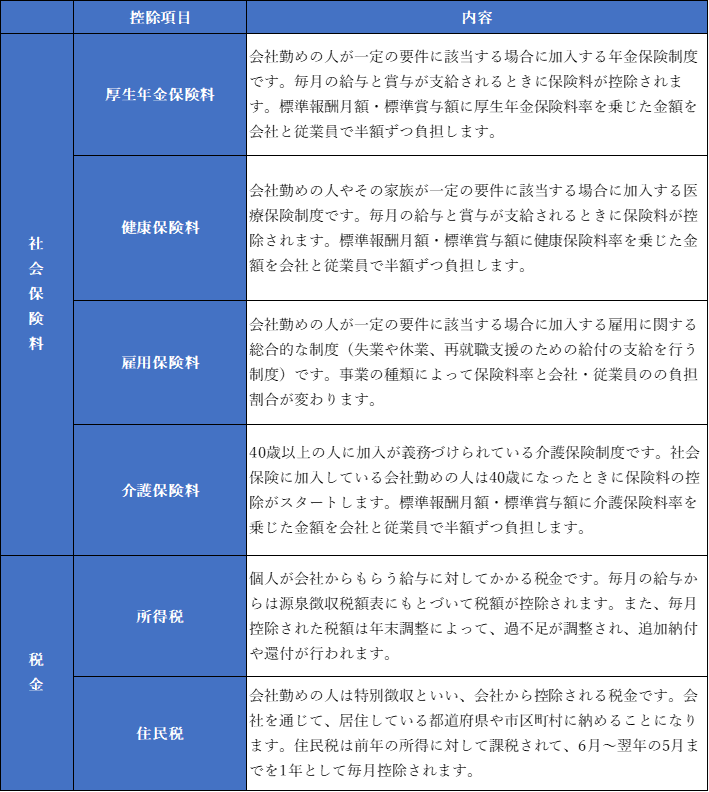 下記、給与から控除されている項目になります。