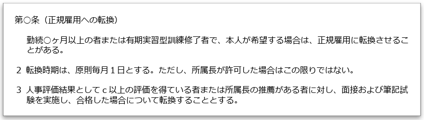 初めに、契約社員やパートタイマー等非正規雇用労働者に適用する就業規則を作成していることが必要です。そのうえで、この就業規則に「正社員転換制度」を規定しておくことが求められます。転換の規定例は以下の図2のとおりです。