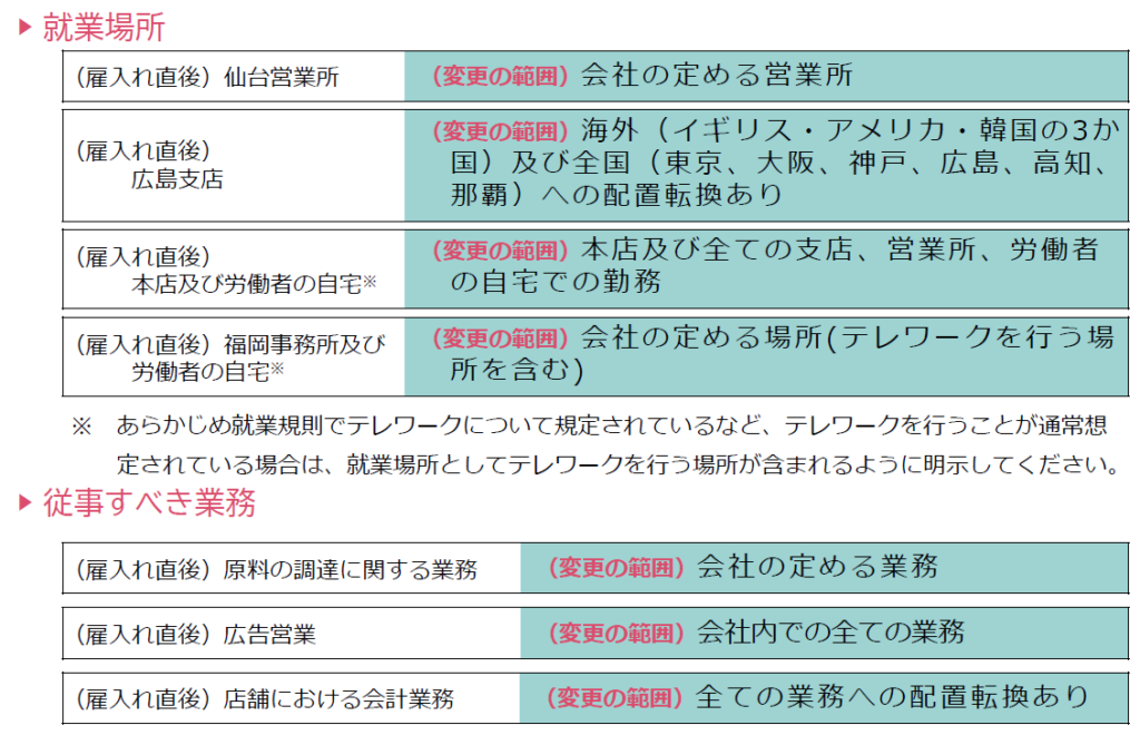 特に就業場所や業務内容について制限がなければ、「会社の定める場所」や「会社の定める業務、全ての業務」等のように包括的に明示しても構いません。また、テレワークも想定するのであれば、図1のとおりあらかじめ明示しておくと良いでしょう。